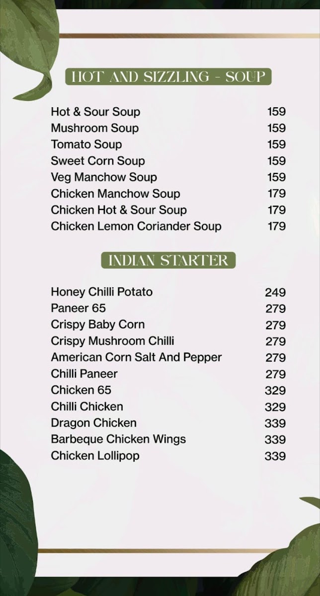 - Soups: Start with a comforting bowl of Hot & Sour Soup or indulge in the creamy Mushroom Soup, each priced at ₹159.